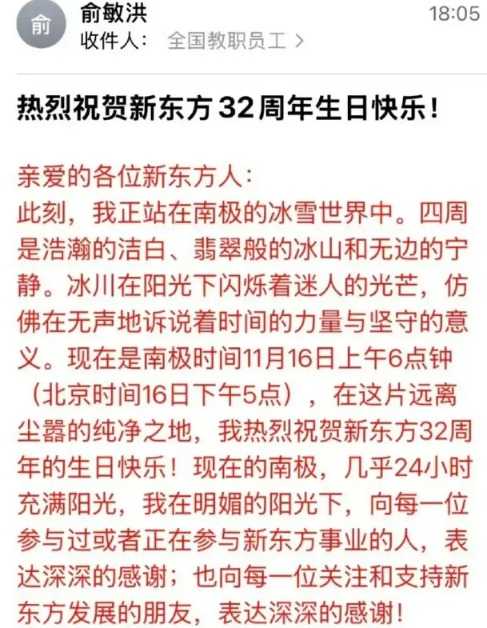 11月16日,新东方迎来成立32周年纪念日,创始人俞敏洪身处南极发布内部信,向全体员工及支持者致谢。该文开篇即细致描绘“浩瀚的洁白、翡翠般的冰山”等南极景观,称当地“几乎24小时充满阳光”的环境让他对“时间的力量与坚守的意义”有了更深感悟。然而这封饱含“南极感悟”的信函并未收获预期的共鸣,有员工在社交媒体暗指老板的“远方”与员工的“现场”形成鲜明对比。更直白的吐槽来自企业邮箱留言称,看到信中对南极风光的描述“只觉得讽刺”。
