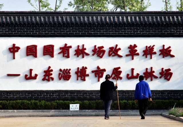 山东淄博原山林场两位晨练的老人从“中国国有林场改革样板”的标语前走过(资料图)。摄影/章轲