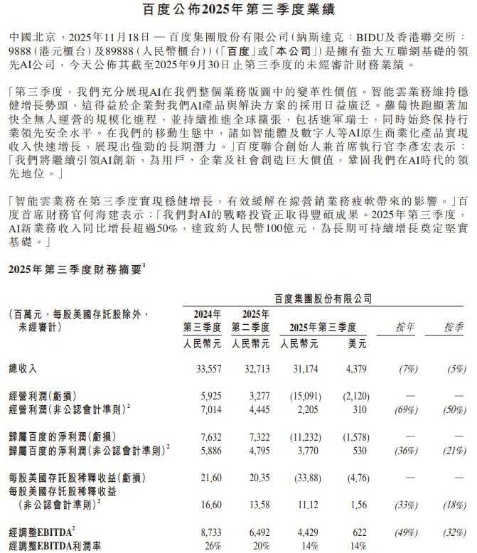 百度2025年Q3财报:AI业务收入同比增长超50%