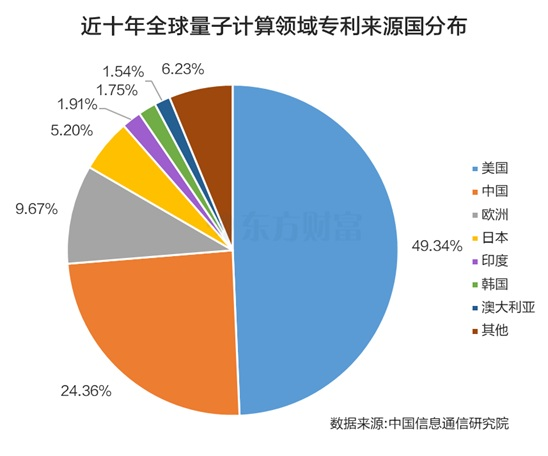 在中国信息通信研究院看来,在量子计算领域,目前已形成了中美引领的局面。截至2025年8月,全球量子计算企业超过400家,其中美国107家、中国42家,双双位居前列。再看过去十年全球量子计算领域专利技术来源国,其中美国占了49.34%,中国占了24.26%,欧洲以9.67%排在第三位,量子科技国际竞争激烈。