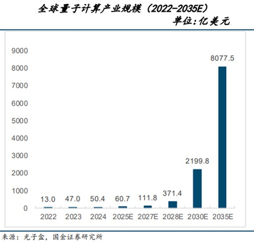 往后看,中国报告大厅网数据显示,我国量子科技市场规模预计到2029年将增至97.58亿美元。2024年至2029年复合年增长率预估为37.45%。国金证券的表示,预计到2030年,全球量子计算产业规模将达到2199.8亿美元,2035年达到8077.5亿美元,量子科技未来市场规模巨大。