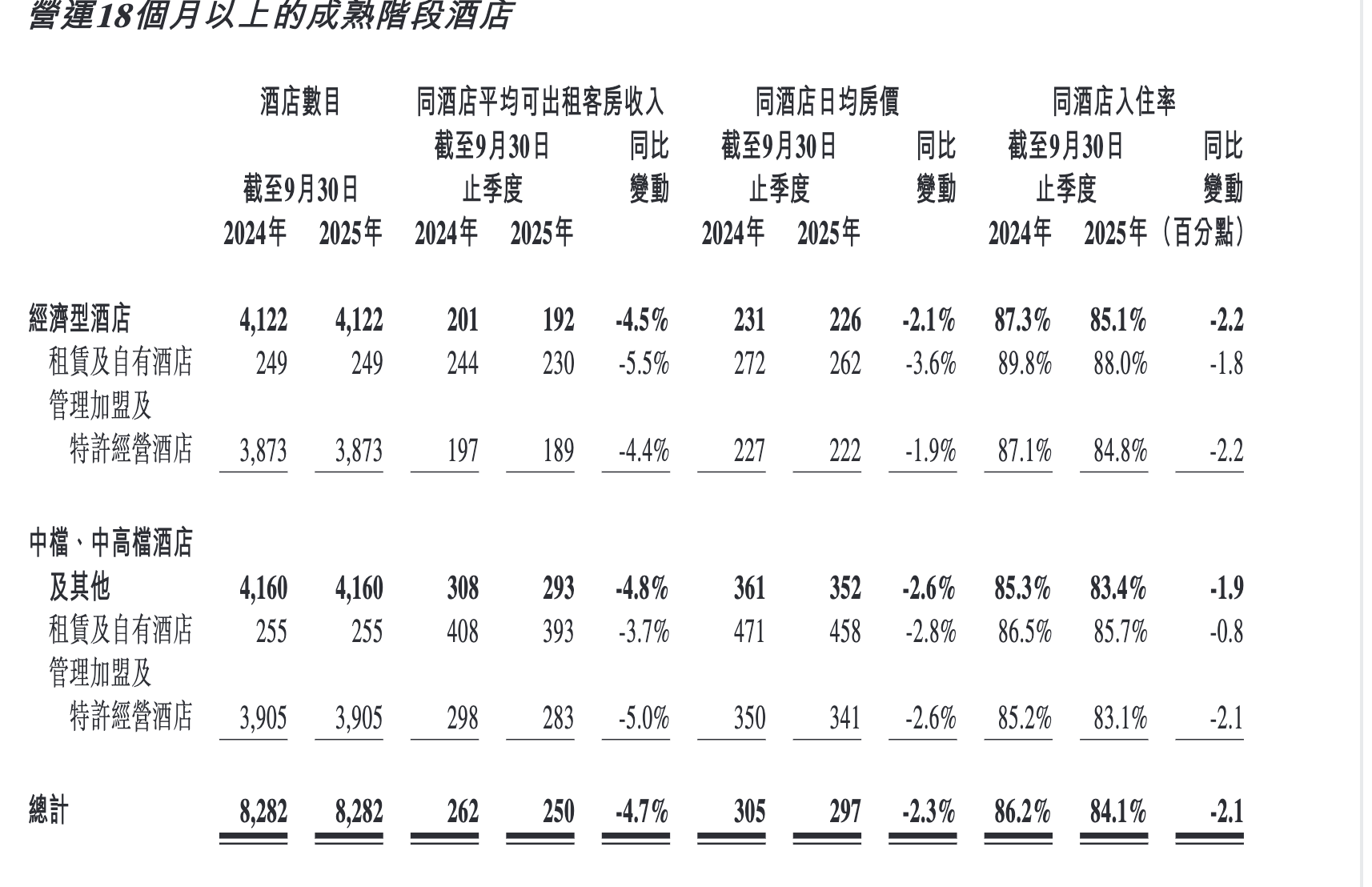 2025年第三季度,中国境内在营至少18个月的酒店同店平均可出售客房收入为250元,与上年同期的262元下跌了12元;其入住率84.1%,与上年同期的86.2%相比下跌了2.1个百分点,同店日均房价则减少了2.3%,经营数据有所波动。