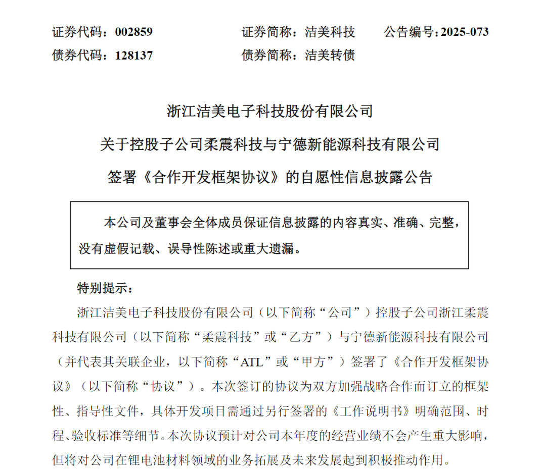 11月18日盘后,洁美科技(002859)披露,公司控股子公司浙江柔震科技有限公司(以下简称“柔震科技”)与宁德新能源科技有限公司(并代表其关联企业,以下简称“ATL”)于当日签署了《合作开发框架协议》(以下简称“协议”)。
