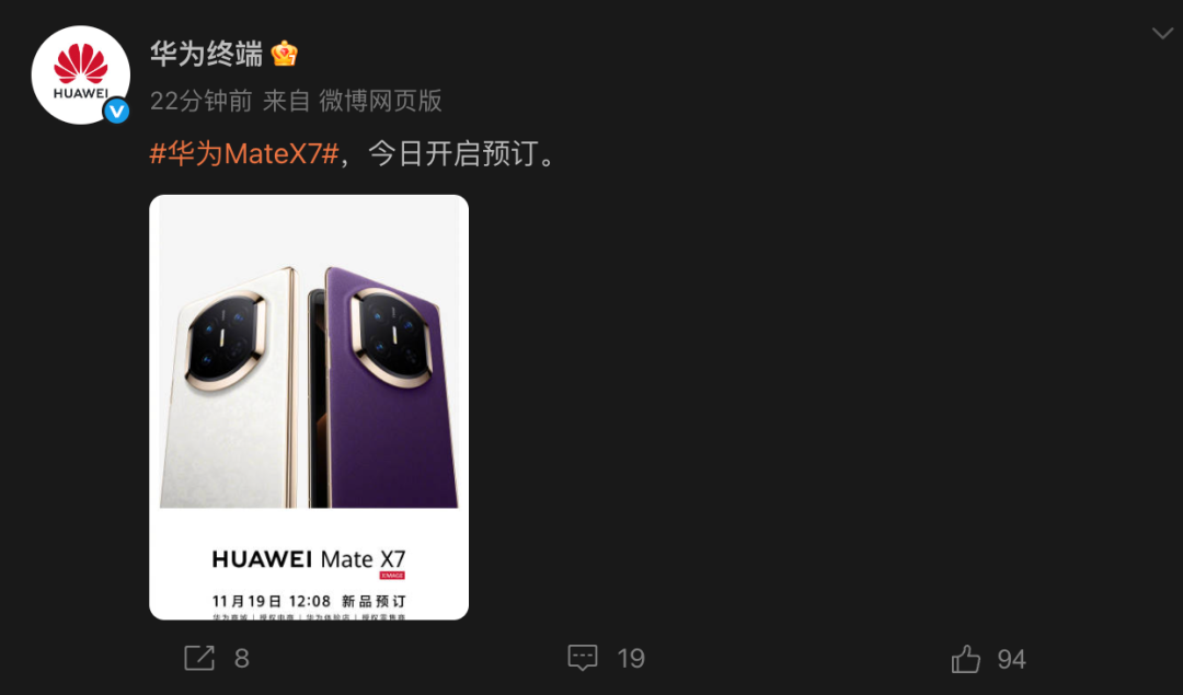同日,华为终端发文宣布华为首款鸿蒙二合一平板电脑MatePad Edge将于11月25日正式发布。这款平板电脑采用独特的二合一形态设计,将电脑、支架、平板形态完美合一,支持电脑、平板双模式,满足用户在不同场景下的使用需求。另外,华为还宣布:Mate X7今日开启预订,进一步丰富了其产品线。
