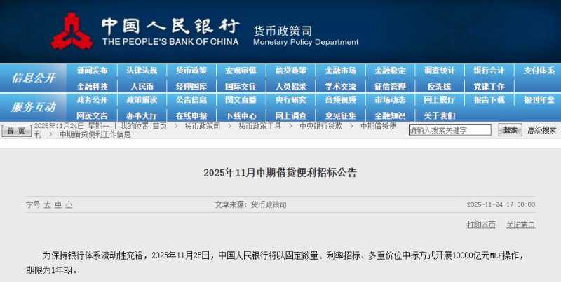 2025年11月25日,中国人民银行以固定数量、利率招标、多重价位中标方式开展10000亿元1年期中期借贷便利(MLF)操作,旨在保持银行体系流动性充裕。此次操作是央行落实稳健货币政策的重要举措,通过中期基础货币投放稳定市场预期。操作信息来源于央行网站。