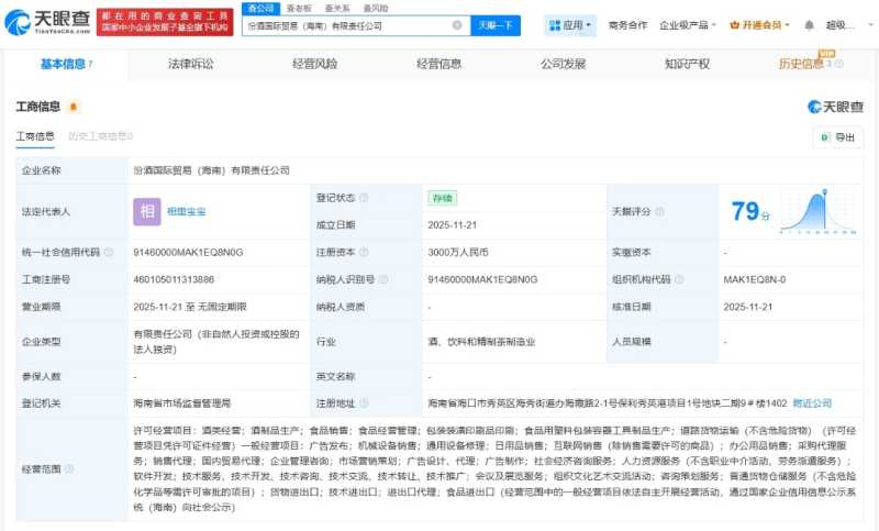 天眼查App显示,近日,汾酒国际贸易(海南)有限责任公司成立,注册资本为3000万人民币,经营范围包括酒类经营等。