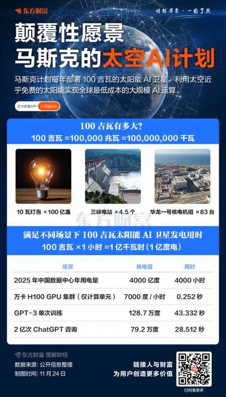 马斯克在接受访谈时提出了一个颠覆性的愿景,即将人工智能计算设施部署在太空,通过每年100吉瓦的太阳能AI卫星为大规模AI提供能源。这一计划有望成为运行和供电AI的最低成本方式。