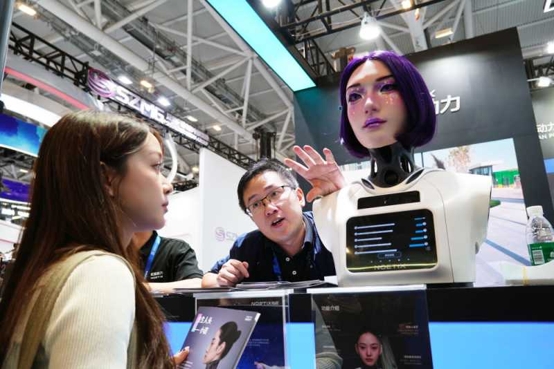 2025年11月14日,观众在第二十七届中国国际高新技术成果交易会现场了解可模仿复杂表情的仿生机器人。新华社记者王丰摄