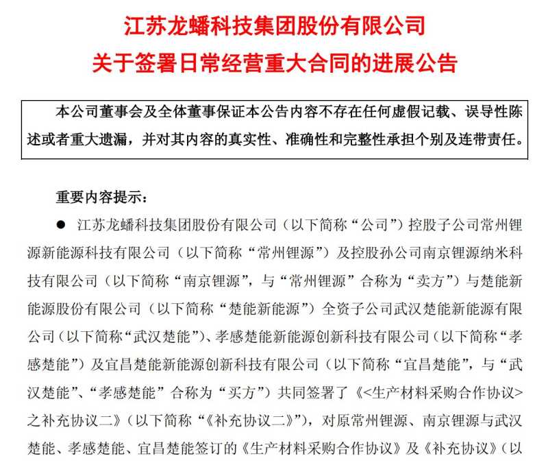 11月24日晚间,龙蟠科技(603906.SH,股价16.42元,市值112.49亿元)公告称,公司控股子公司常州锂源及控股孙公司南京锂源(以下简称“卖方”)与楚能新能源全资子公司武汉楚能、孝感楚能及宜昌楚能(以下简称为“买方”)共同签署了《补充协议二》,对原协议相关条款进行补充与修订。原协议约定,2025年至2030年,卖方合计向买方销售15万吨磷酸铁锂正极材料产品。此次《补充协议二》约定,2025年至2030年,卖方合计向买方销售130万吨磷酸铁锂正极材料产品。如按照预计数量及市场价格估算(不考虑客供碳酸锂模式的情况下),《补充协议二》与原协议总销售金额超450亿元(最终根据销售订单据实结算)。