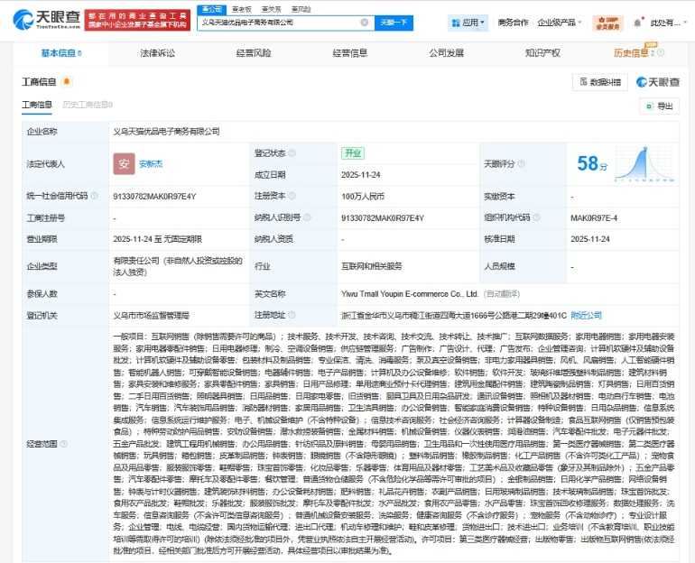近日,义乌天猫优品电子商务有限公司成立,注册资本100万人民币,经营范围涵盖多个领域。该公司由淘天有限公司全资持股,后者为淘宝(中国)软件有限公司全资子公司。