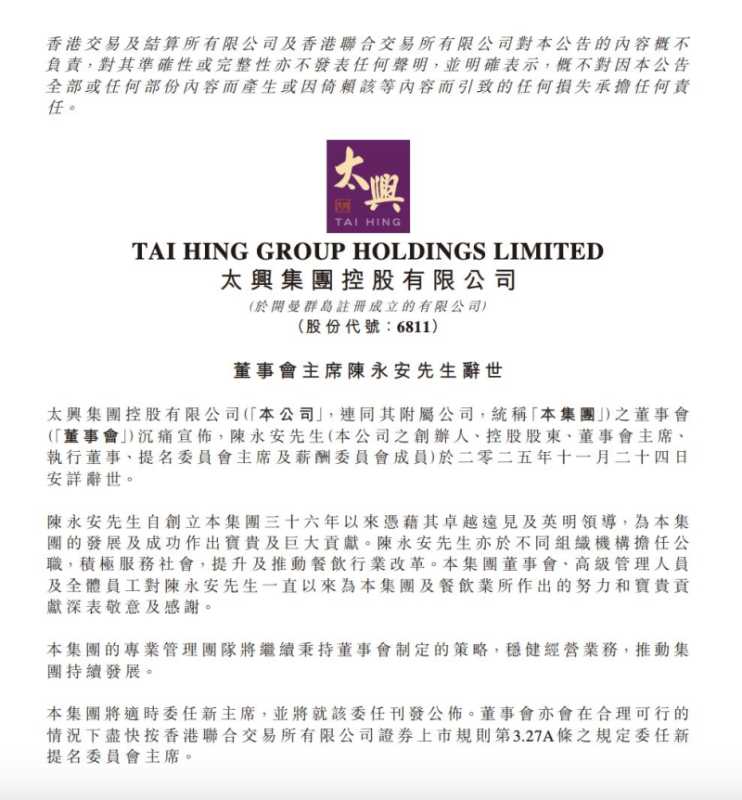 昨天(11月24日)22时许,知名连锁餐饮企业太兴集团在港交所发布公告称,太兴集团控股有限公司创办人、控股股东兼董事会主席陈永安于11月24日当天辞世。