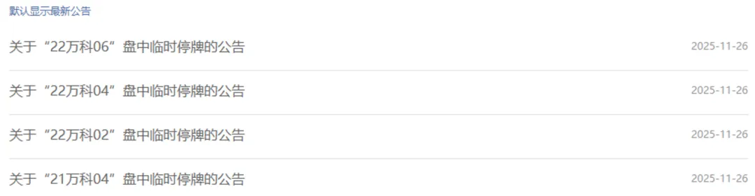 深交所公告称,“21万科04”(149478)盘中成交价较前收盘价首次下跌达到或超过20%,根据《深圳证券交易所债券交易规则》和《关于对债券匹配成交实施盘中临时停牌有关事项的通知》等有关规定,本所自今日10时11分55秒起对该债券实施临时停牌,于10时41分56秒复牌。