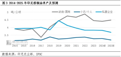 同时,印尼油棕种植园的管理水平参差不齐,导致政府/国有种植园、大型私营种植园与小农户之间的单产存在显著差异。一般而言,印尼政府及国有种植园的年单产最高,可达约4.5吨/公顷,而小农户受限于资金与技术,单产普遍偏低,多维持在3.5吨/公顷以下。