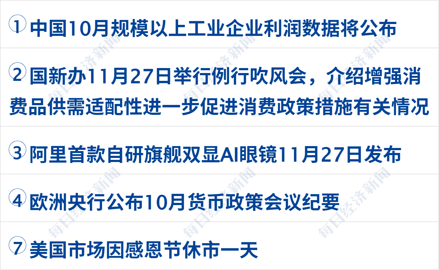 优化内容:隔夜市场美股三大指数集体收涨,道琼斯指数涨0.67%,标普500指数涨0.69%,纳斯达克综合指数涨0.82%。大型科技股多数上涨,甲骨文涨超4%,AMD涨超3%,英伟达、特斯拉、奈飞、微软涨超1%。热门中概股涨跌互现,纳斯达克中国金龙指数收跌0.03%。哔哩哔哩、小鹏汽车跌超2%,百度跌1.3%,京东涨0.9%,阿里巴巴涨0.38%。美联储发布的经济褐皮书报告显示,美国经济活动近期几乎陷入停滞。美国制造业和零售业普遍面临投入成本压力,主要反映关税导致的价格上涨。国际油价上涨,纽约商品交易所1月交货的轻质原油期货价格上涨70美分,收于每桶58.65美元。欧洲主要股指集体收涨,欧洲斯托克50指数涨1.50%。商务部长与欧盟委员会贸易和经济安全委员就安世半导体等经贸问题深入交换意见。六部门联合发文,以消费升级引领产业升级,促进消费的实施方案提出,到2027年,消费品供给结构明显优化。外交部发言人表示,日方所谓的涉台“一贯立场”未变远远不够。中国驻日本大使馆再次提醒中国公民注意人身安全。石破茂再批高市早苗言论强调与中国关系重要性。科技部会同有关部门部署开展学术不端撤稿论文专项整治行动。海南公安机关成功将11名涉嫌从事私彩赌博活动的犯罪嫌疑人从马来西亚押解回国。中国保险行业协会发布提示,“安我股保”并非国家金融监督管理总局批准设立的保险机构。中央网信办召开优化营商网络环境工作经验总结交流会。北京市网信办会同北京金融监管局联合部署开展金融领域网络乱象治理专项行动。白宫附近发生枪击事件,两名国民警卫队员死亡,白宫进入封锁状态。许家印前妻丁玉梅更多资产曝光,恒大资产处置再起重要进展。万科债券疑将展期,浦发银行召集万科债券会议。小米集团继续斥资3亿港元回购750万股。理想汽车三季度营收274亿元,MEGA获三季度高端纯电市场销量冠军。分仓佣金缩水三成后的震荡,广发证券戴康离职。原极氪汽车CBO关海涛入职荣耀。罗永浩发声要求公开道歉。成人用品品牌KISSTOY致歉。特斯拉高管辟谣“供应链去中国化”。意大利反垄断机构认定美国“元”公司滥用市场支配地位。