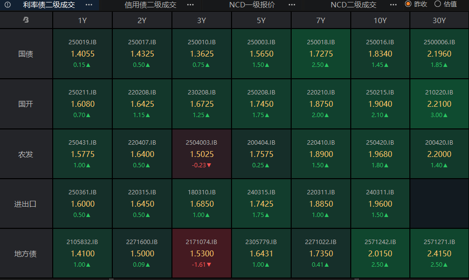 截至今日18点,利率市场收益率多数上行,1Y国债上行0.15bp至1.41%,3Y国债上行0.75bp至1.36%,5Y国债上行1.75bp至1.57%,10Y国债上行1.75bp至1.84%,30Y国债上行1.75bp至2.20%,10Y国开上行2.1bp至1.90%。信用市场收益率多数大幅上行,2Y期AAA信用债上行3bp至1.78%,3Y期AAA信用债上行2.75bp至2.00%,5Y期AAA信用债上行2.5bp至2.21%。转债方面,中证转债指数今日收盘报481点,收跌0.85%。