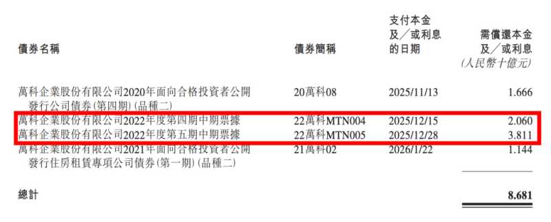 截至今年三季度末,万科已完成288.9亿元公开债务的偿还,且2027年之前已无境外公开债到期。不过,对万科而言,其年内仍有两笔境内债券将到期兑付,除了上述提及的22万科MTN004,还有一笔到期日为12月28日的22万科MTN005,两笔债券余额57亿元,需偿还本金及利息约58.71亿元。