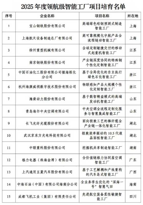 工业和信息化部等六部门正式公布首批领航级智能工厂名单,标志着我国智能制造进入关键跃升期。这些智能工厂融合了新一代信息技术,代表制造业智能化最高标准。