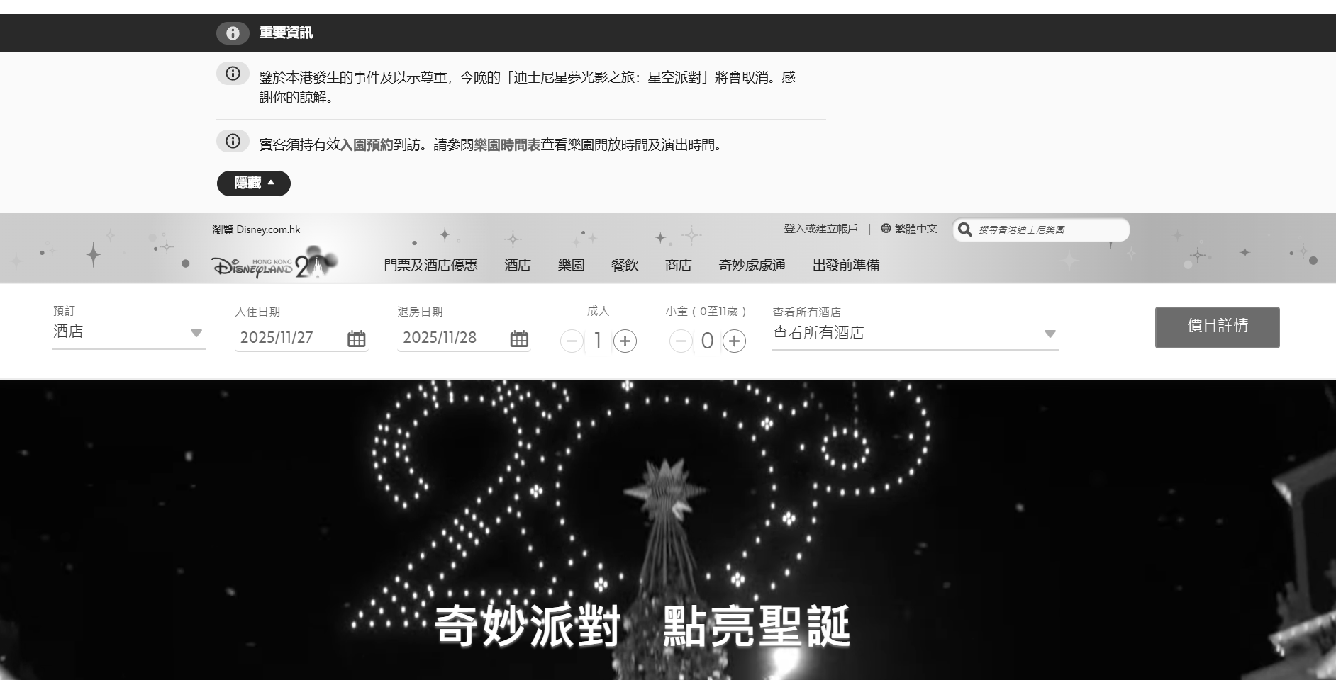 香港迪士尼取消星空派对 官方页面转黑白 致敬近期事件