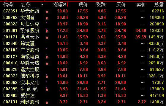 跨境电商概念盘中走势活跃,截至收盘,华光源海、太湖雪30%涨停,贝仕达克连续两日涨停,凯淳股份涨幅超过12%,跨境通、南极电商、生意宝等均涨停。