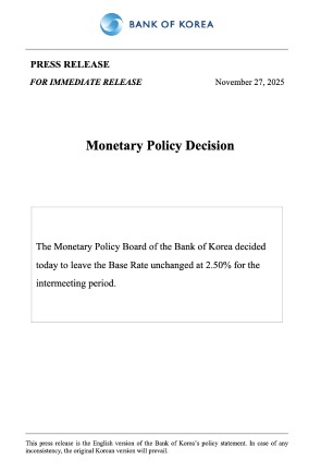 11月27日,韩国央行宣布将基准利率维持在2.50%不变,符合市场预期。这是韩国央行自今年5月以来,连续第四次维持利率不变。去年10月,韩国央行开启降息周期,将基准利率从3.50%下调至目前的2.50%。