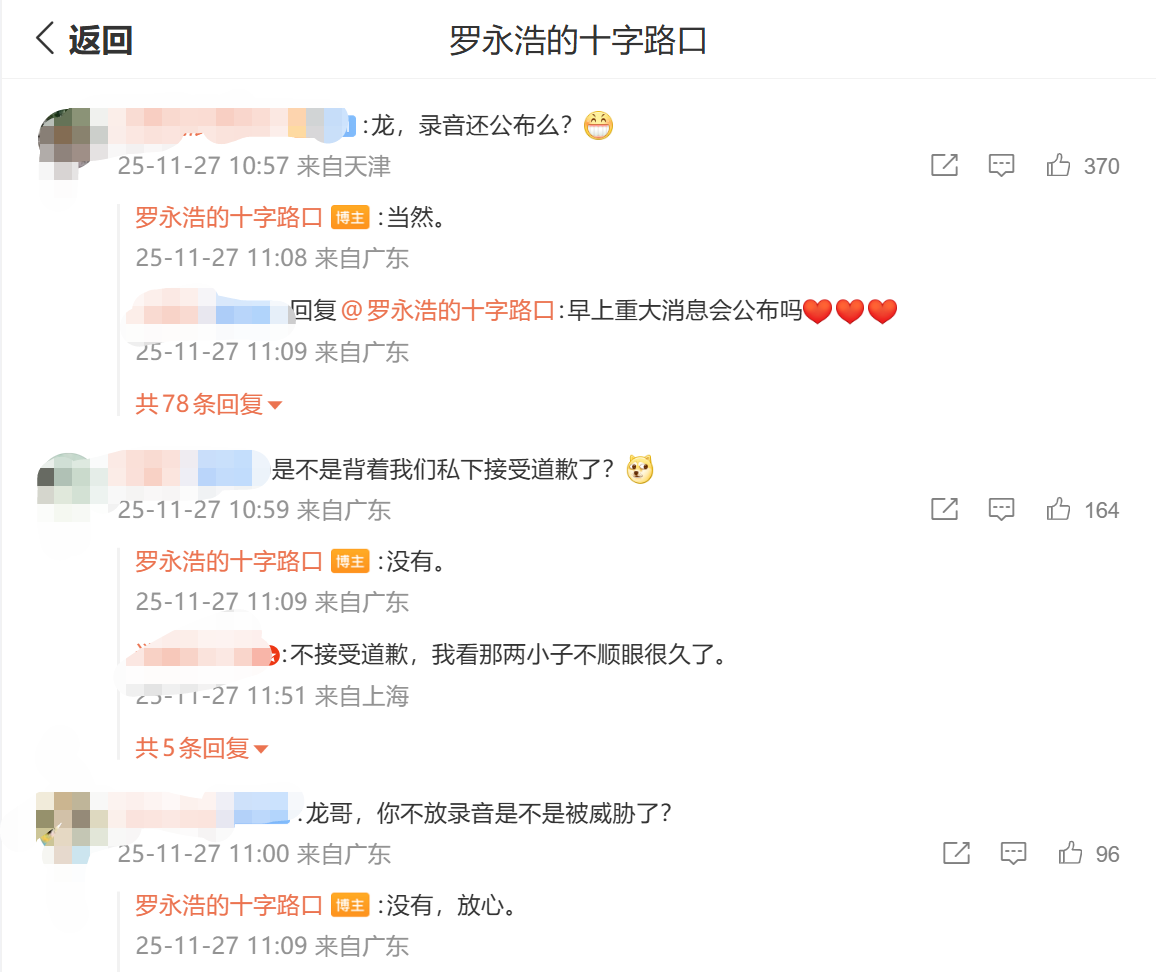 11月27日上午,罗永浩透过微博 @罗永浩的十字路口评论区回应网友提问。有网友问及,“录音还公布么?”,罗永浩回应,“当然”。还有网友提问,“是不是背着我们私下接受道歉了?”对此,罗永浩表示,“没有。”此外,对于网友提出的“不放录音是不是被威胁了?”,罗永浩称,“没有,放心。”