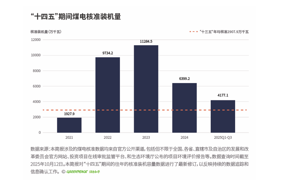 据《报告》统计,截至2025年三季度,“十四五”期间全国累计核准煤电装机约3.35亿千瓦,是“十三五”的两倍多。