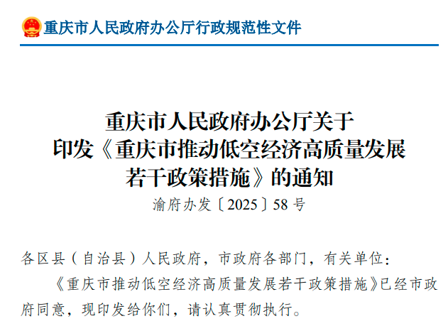 日前,重庆市人民政府办公厅印发《重庆市推动低空经济高质量发展若干政策措施》,政策实施期限到2027年12月31日。重庆提出真金白银补贴低空经济的发展,补贴方向涉及低空示范场景、低空产业创新发展、低空保障体系,补贴对象包括通用航空、无人机整机及零部件制造、低空飞行运营及保障等相关企业。