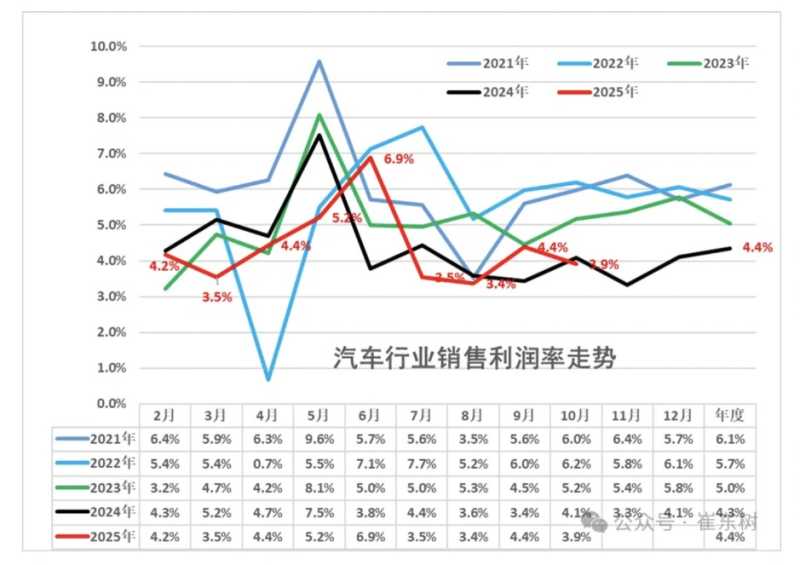11月27日,乘联分会秘书长崔东树披露的数据显示,2025年10月份,汽车行业销售利润率3.9%,环比9月下降0.5个百分点,达到五年同期最低。2025年1-10月份,汽车行业销售利润率4.4%,好于2024年,但仍处于五年来的次低位。