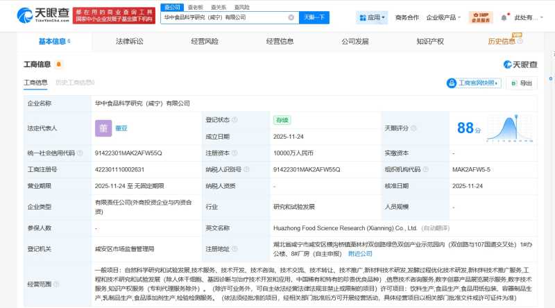 华中食品科学研究(咸宁)有限公司成立,注册资本1亿,经营范围广泛