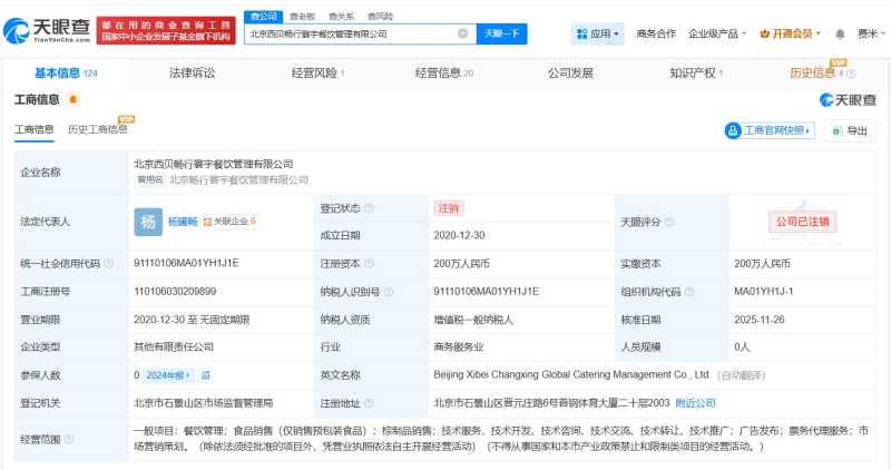天眼查工商信息显示,北京西贝畅行寰宇餐饮管理有限公司已注销,此前已发布简易注销公告。公司成立于2020年12月,法定代表人为杨圃畅,注册资本200万人民币。