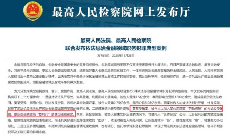 最高人民法院、最高人民检察院近日联合发布了6件金融领域职务犯罪典型案例,其中包括‘黄某受贿案’,涉及政商‘旋转门’受贿犯罪等新型受贿形式。