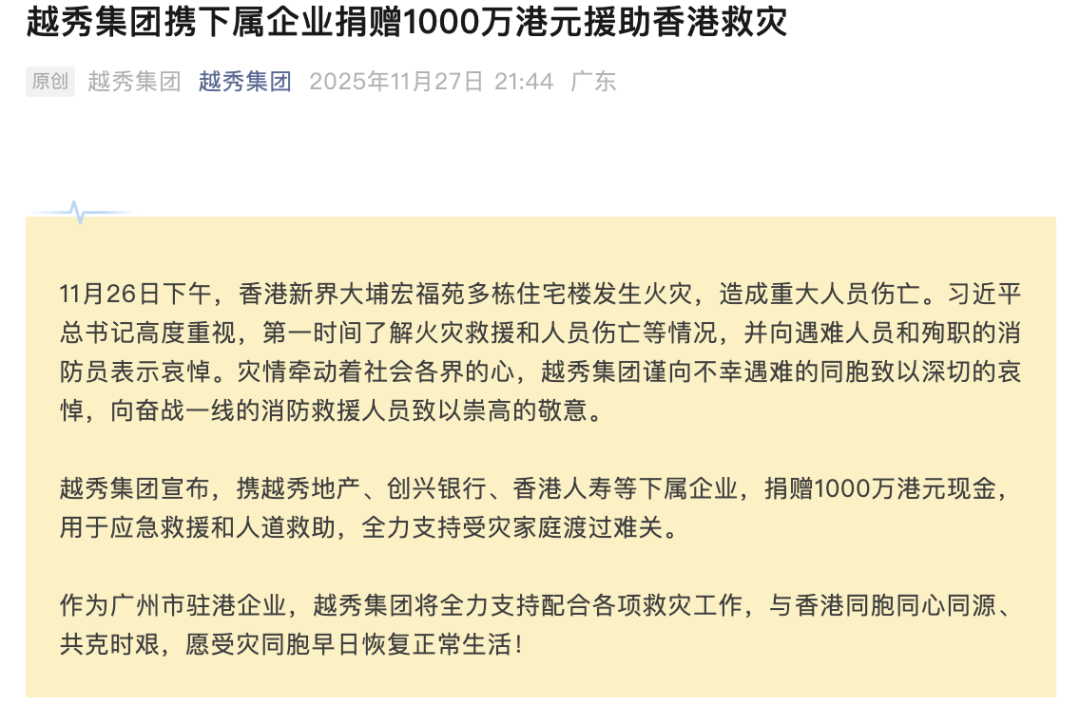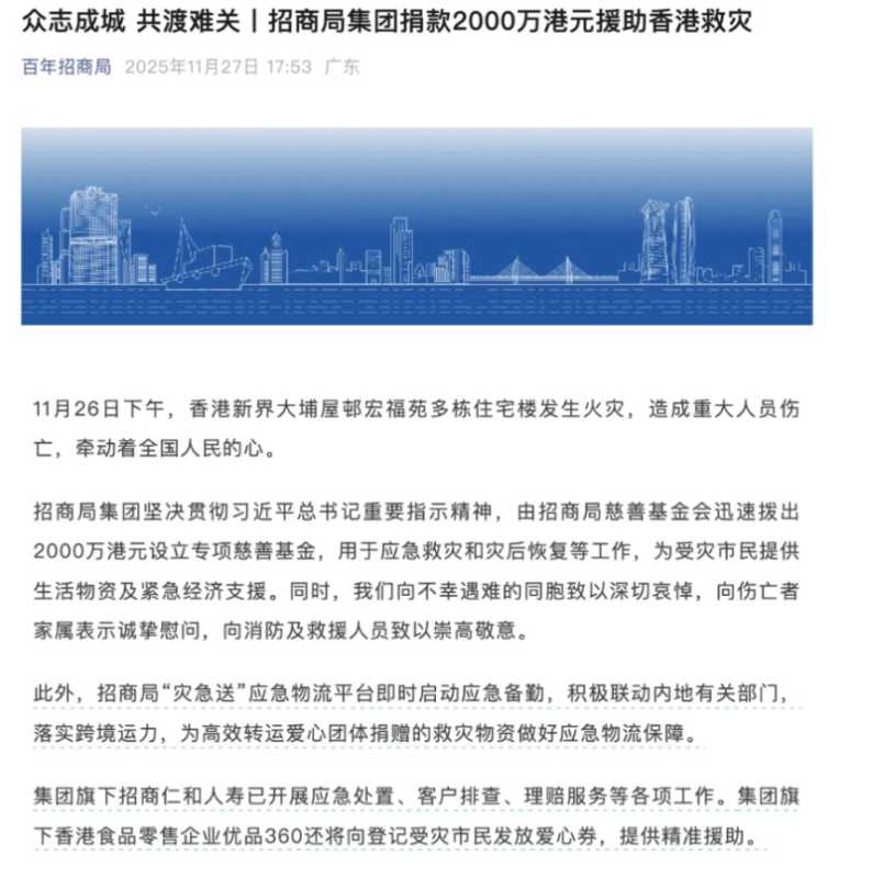 香港大埔宏福苑火灾引发各界关注,多家企业捐赠援助