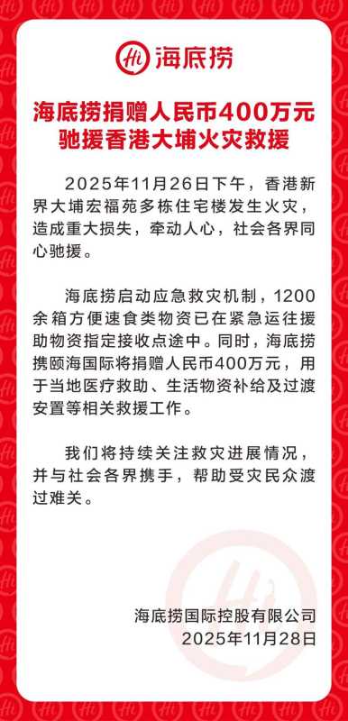 海底捞启动应急救灾机制,捐赠400万元人民币用于香港火灾救援,包括医疗救助、生活物资补给及过渡安置。