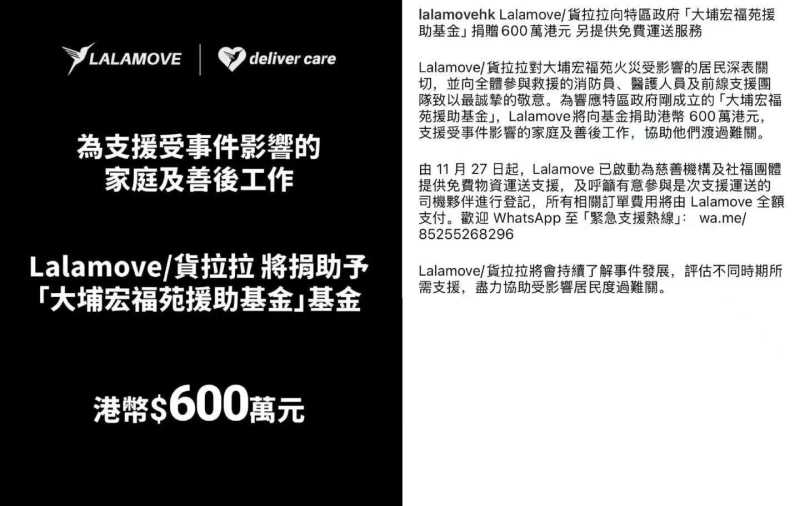 南都湾财社记者获悉,货拉拉(Lalamove)于11月28日宣布,向香港特区政府成立的“大埔宏福苑援助基金”捐助600万港元,支援受灾家庭及善后工作。货拉拉方面表示,11月27日起,已启动为慈善机构及社会福利团体提供免费物资运输支援,订单相关费用由货拉拉全额支付。