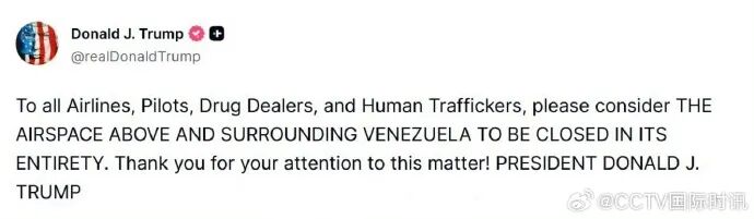据CCTV国际时讯消息,美国总统特朗普11月29日在其社交平台“真实社交”上发文称:“致所有航空公司、飞行员、毒贩和人口贩运者:请注意,委内瑞拉上空及周边的全部空域均被视为关闭。”