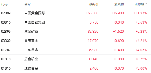 截至收盘,中国黄金国际(02099.HK)涨11.37%、中国白银集团(00815.HK)涨5.63%、紫金矿业(02899.HK)涨5.28%。