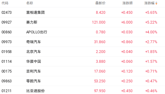 截至收盘,赛力斯(09927.HK)涨5.22%、奇瑞汽车(09973.HK)涨2.77%、北京汽车(01958.HK)涨1.85%。