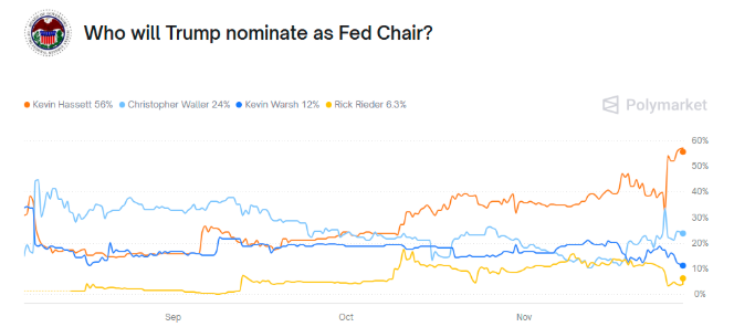 Polymarket等博彩市场立即作出了反应,哈西特当选下任美联储主席的概率一举突破了50%——远超美联储理事沃勒的约22%,两者的赔率此前曾长期不相上下。