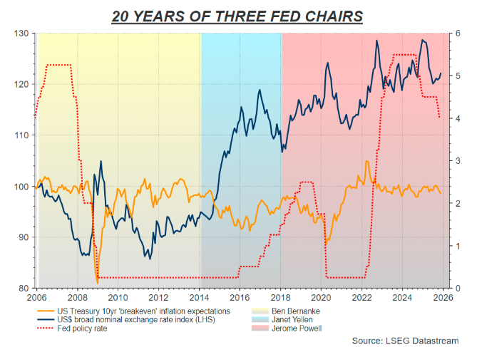 正如同Timiraos本周最新所撰文感慨的,本轮美联储主席的接班,正呈现数十年来少有的非典型形态——从1987年艾伦·格林斯潘接替保罗·沃尔克开始,每一位新上任的美联储主席(伯南克、耶伦、鲍威尔)都“萧规曹随”——承诺保持政策连续性以促进市场稳定。