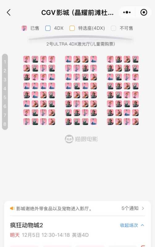 12月4日,界面新闻记者在猫眼售票平台查询发现,上海晶耀前滩店12月5日、12月6日、12月7日周末4D场次的票109元起,已经全部售完。在北京,CGV奥体店12月5日的4D场次,票价99元起,仍有少量余票。