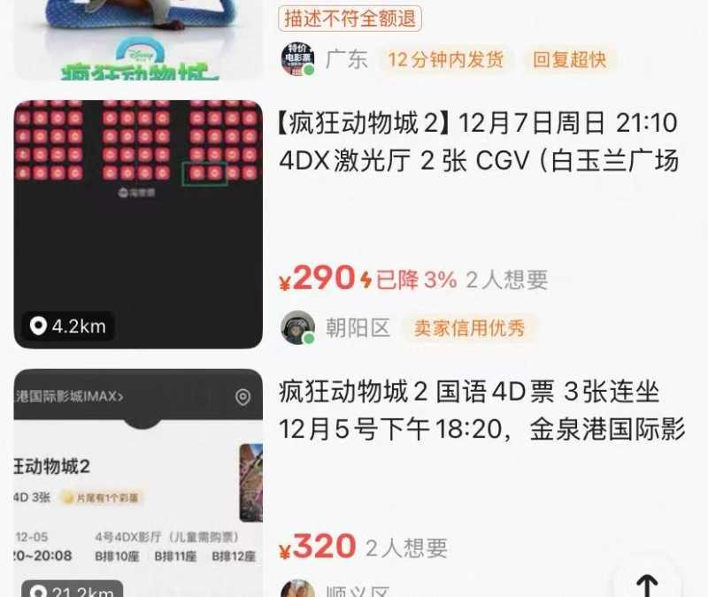 因播放4D效果的影院有限,购票难度也显著增加,出现“一票难求”的情况。甚至在部分二手交易平台上,《疯狂动物城2》4D电影票大量被加价转售。