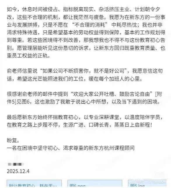 如今,休息时间被侵占、指标脱离现实、杂活挤压主业、计划朝令夕改,这些不合理的机制,都让我茫然与疲惫。我愿为在新东方的一份事业与发展拼搏,只是不愿在“不合理的消耗” 中耗尽热忱;我也并非渴求特殊待遇,只是希望基本的劳动权益得到保障,基本的工作规划得到尊重。若这些困境得不到改善,那我想我也不得不与这份教育初心告别。愿管理层能听见这份恳切的诉求,让新东方回归既重教育质量、也重员工权益的正轨。