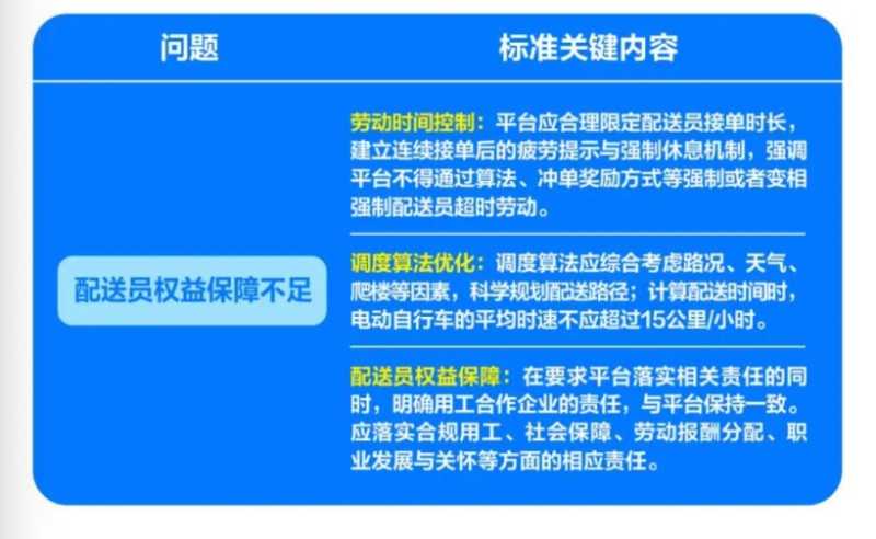 其中,外卖新国标聚焦平台用工管理,强化配送员权益保障。围绕劳动强度、职业关怀和社会保障等方面,提出合理确定劳动时间、完善职业培训体系、探索多元保障方式等内容,助力健全配送员权益保障机制。