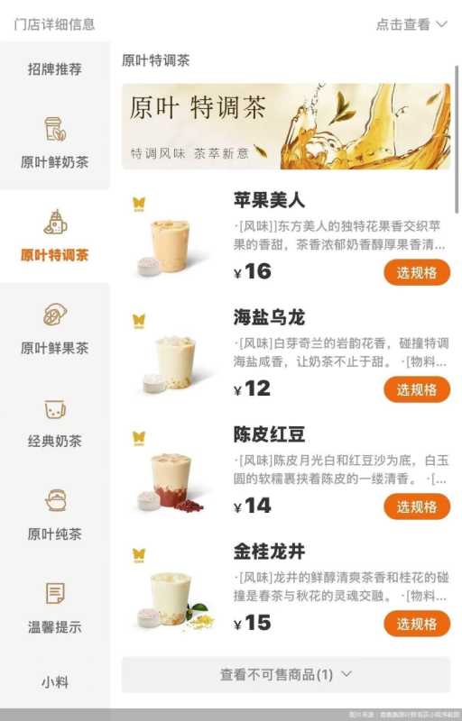 北京商报记者注意到,这家位于杭州大悦城负一层的香飘飘首家奶茶店,在门店布局上与一般奶茶店无异,门口巨大的“香飘飘杯装奶茶”引人注目,店内还增加了冲泡产品的展示台。根据线上点单系统,该店主打“原叶现泡”概念,目前在售五大系列产品,分别是原叶鲜奶茶、原叶特调茶、原叶鲜果茶、经典奶茶和原叶纯茶,价格在5.9元至16元之间。原叶纯茶价位较低,均为5.9元/杯,主要原料为陈皮月光白、茉莉绿茶、白芽奇兰、龙井、东方美人等。原叶特调茶和原叶鲜果茶价位较高,其中苹果美人售价16元/杯,主要原料为东方美人、牛奶、苹果汁和白玉圆。