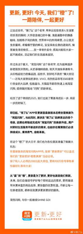 淘宝闪购方面向记者表示:“更新是为了更好,更好也激励我们常新。”这是饿了么多年沉淀的服务和履约能力、产品技术、用户信任与组织韧性的全面检验和焕新升级,由此将更深度融入阿里集团“大消费平台”战略,释放更大价值,在服务用户、商家、骑士的道路上迈出更关键的一步。