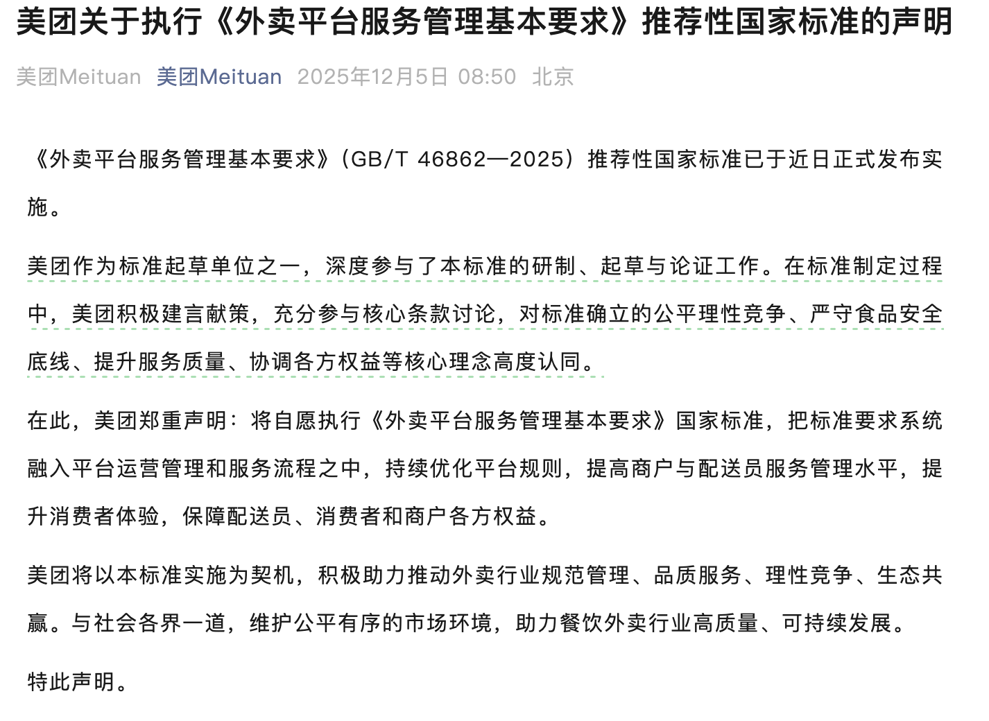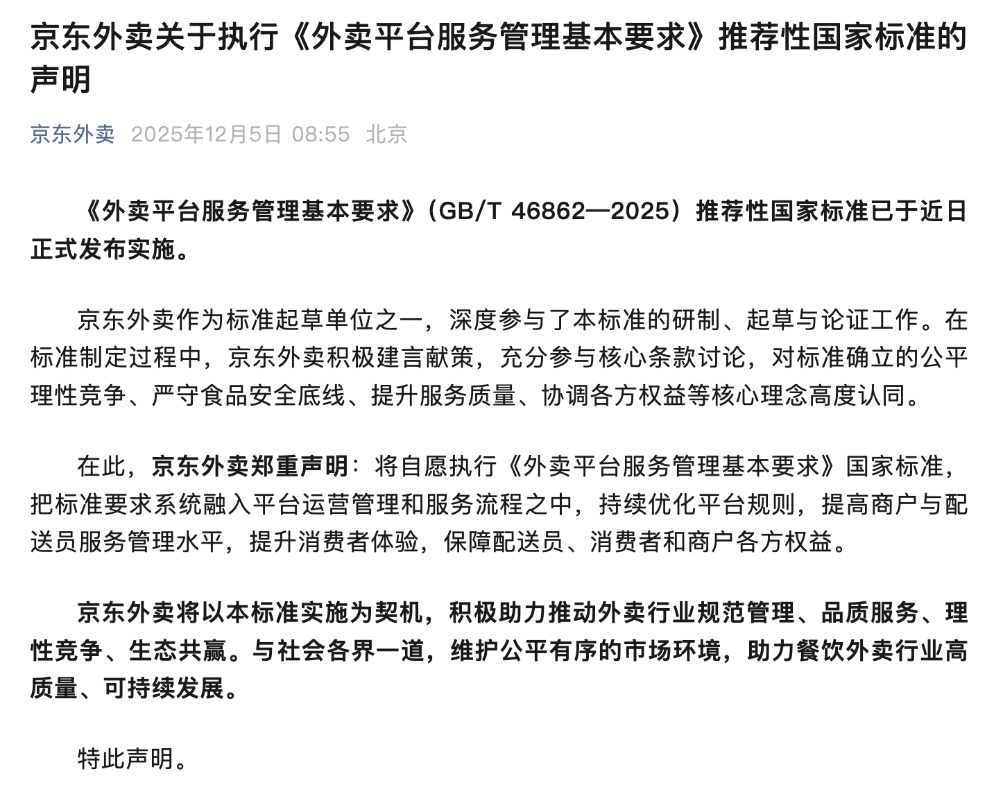 美团、京东外卖、淘宝闪购近日发布声明,将执行《外卖平台服务管理基本要求》国家标准,提升消费者体验,保障各方权益。