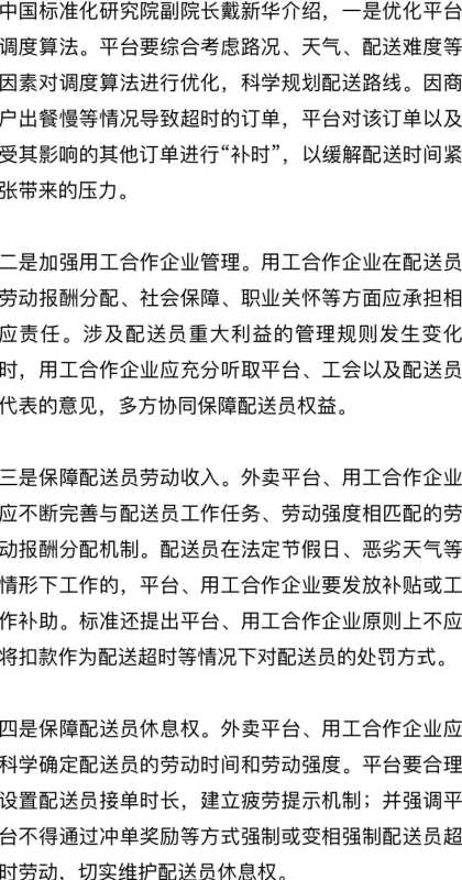 针对外卖配送员劳动时间长、工作强度大等问题,标准从多方面提出相关要求。