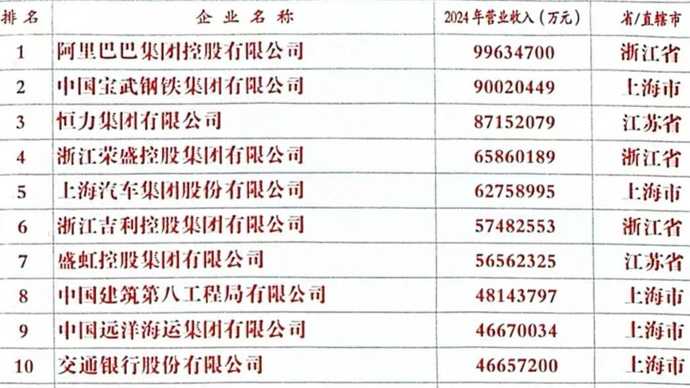 根据榜单,长三角企业营业收入前十名企业为:阿里巴巴集团控股有限公司、中国宝武钢铁集团有限公司、恒力集团有限公司、浙江荣盛控股集团有限公司、上海汽车集团股份有限公司、浙江吉利控股集团有限公司、盛虹控股集团有限公司、中国建筑第八工程局有限公司、中国远洋海运集团有限公司、交通银行股份有限公司。