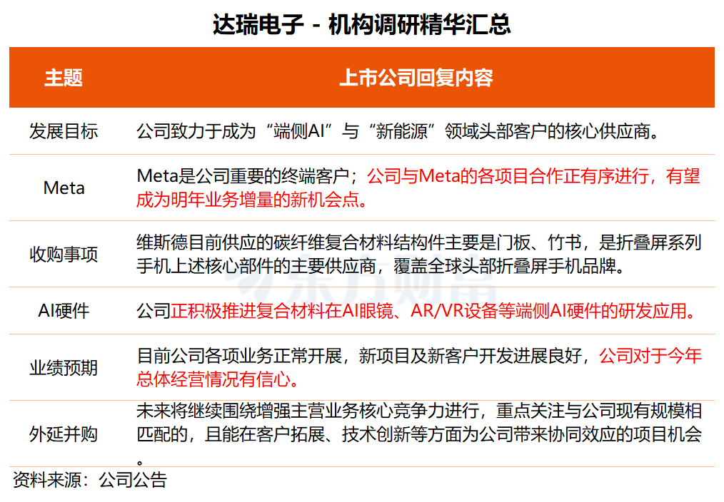 达瑞电子于昨日接受南方基金、天风证券多位分析师的现场调研,公司在交流中透露,Meta是公司重要的终端客户,公司与其各项目合作正有序进行,有望成为明年业务增量的新机会点。