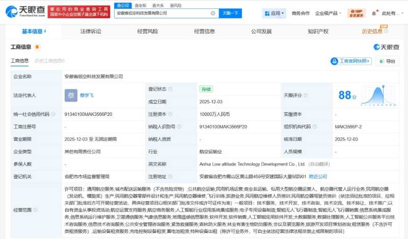 安徽省低空科技发展有限公司成立,涉及通用航空服务